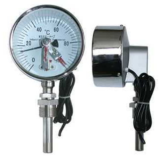 电接点双金属温度计是利用温度变化时带动触点变化,当其与上下限触点接触或断开的同时,使电路中的继电器动作,从而自动控制和报警。